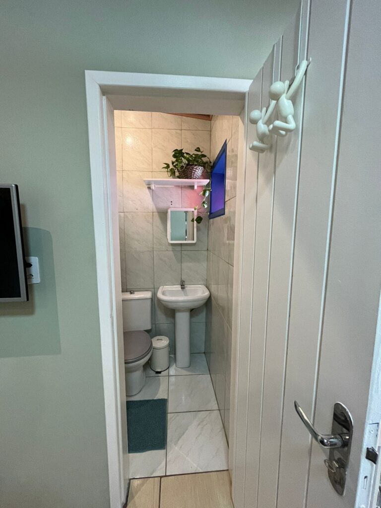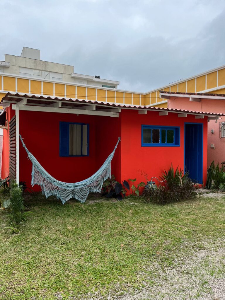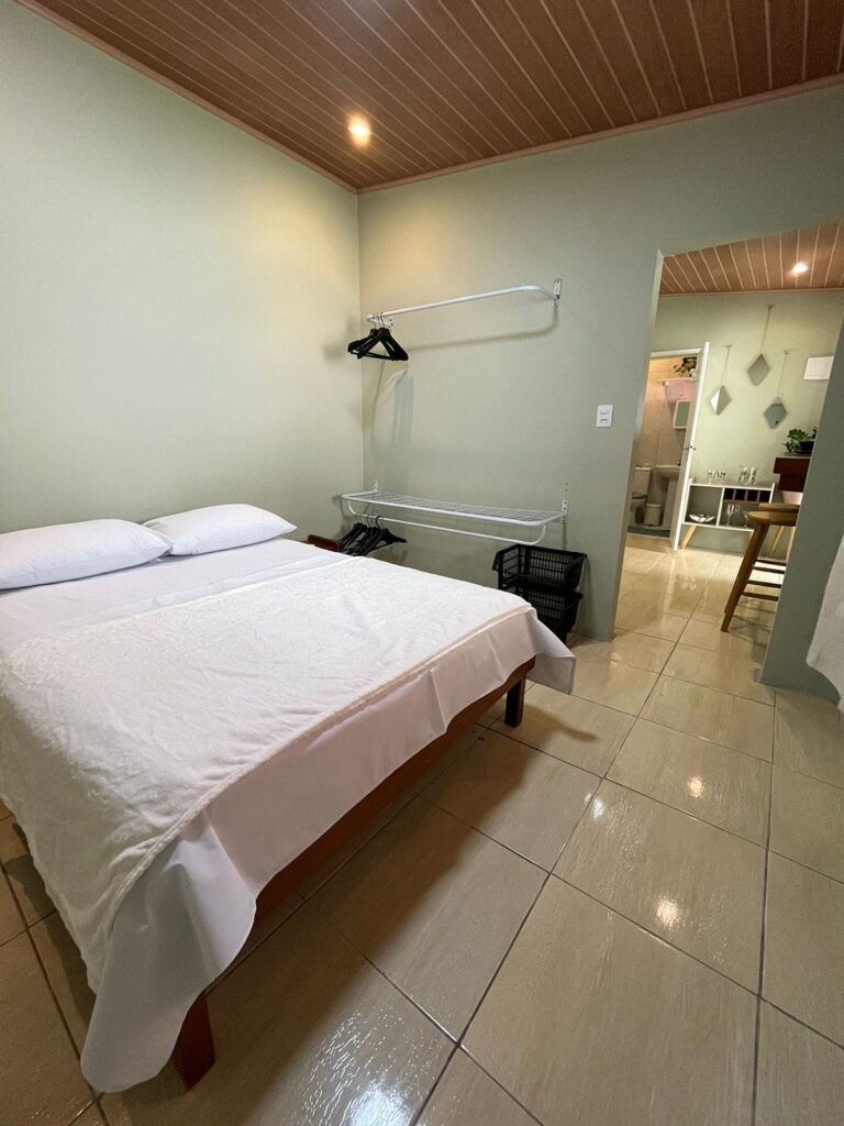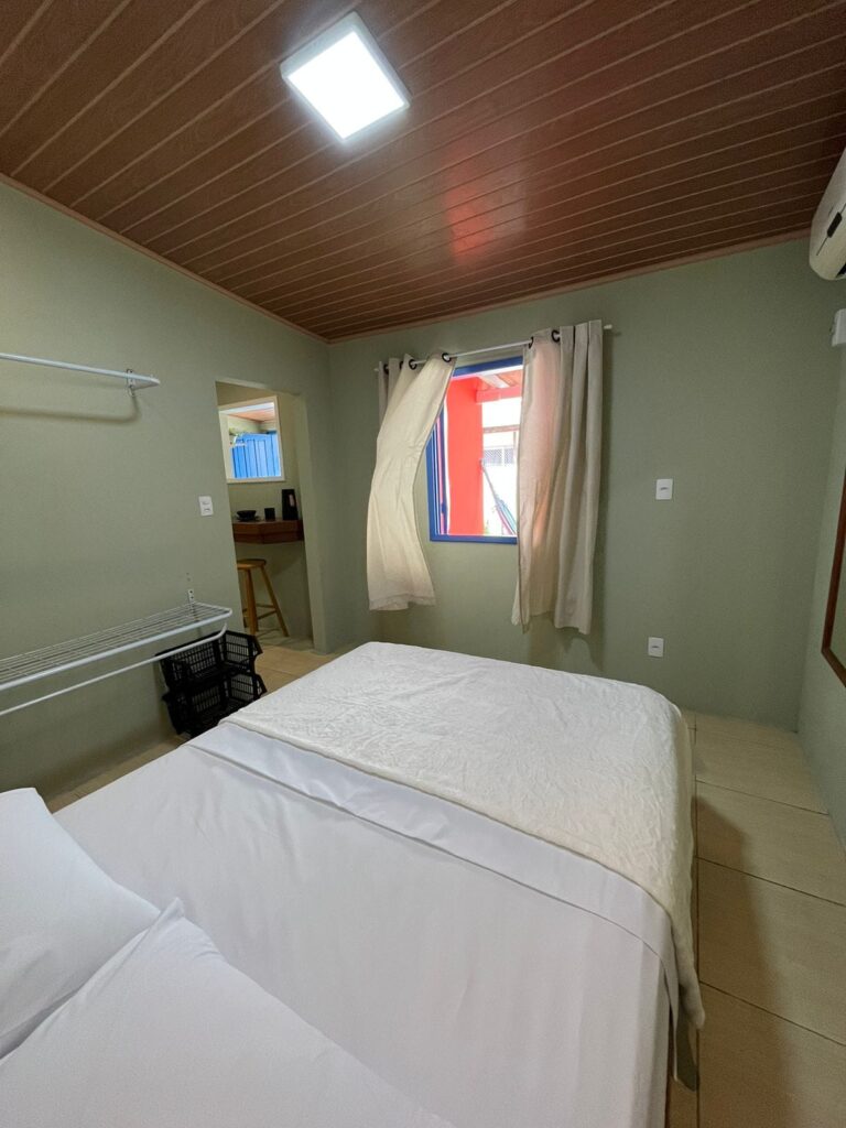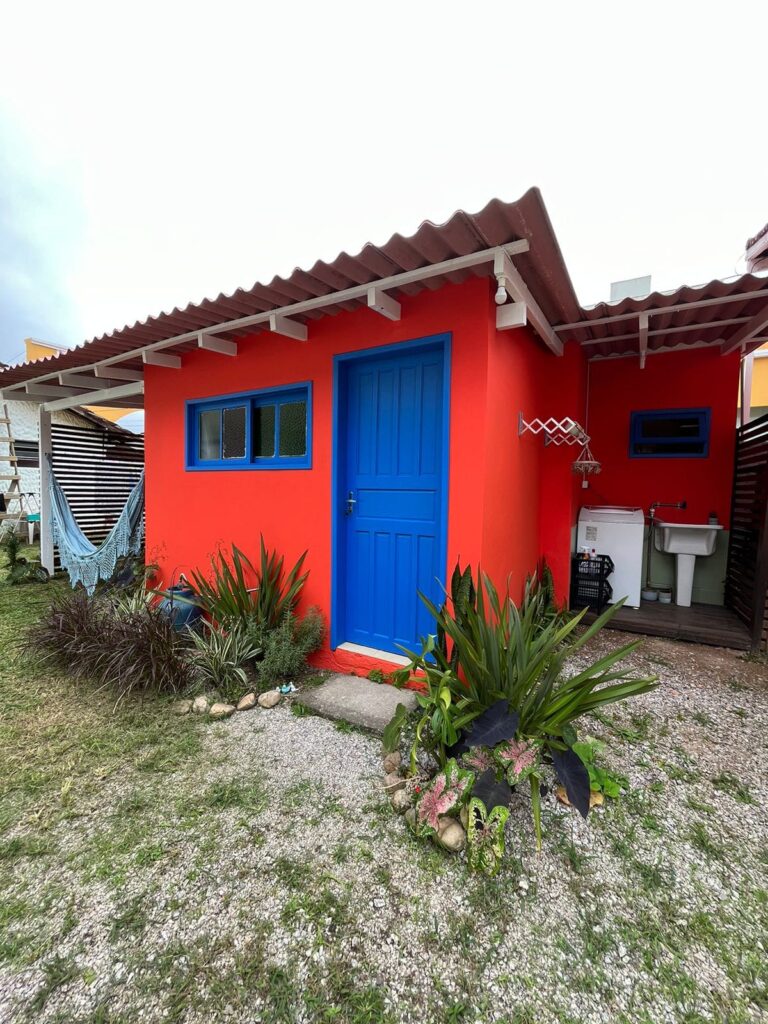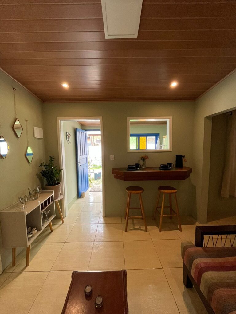 Acogedora cabaña en Cachoeira do Bom Jesus con dormitorio, baño, cocina equipada, sala de TV, wifi, aire acondicionado y estacionamiento.