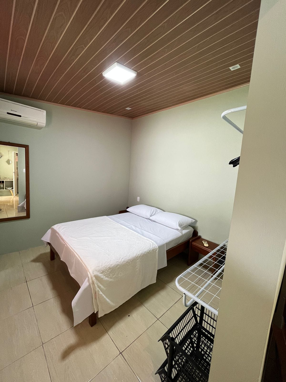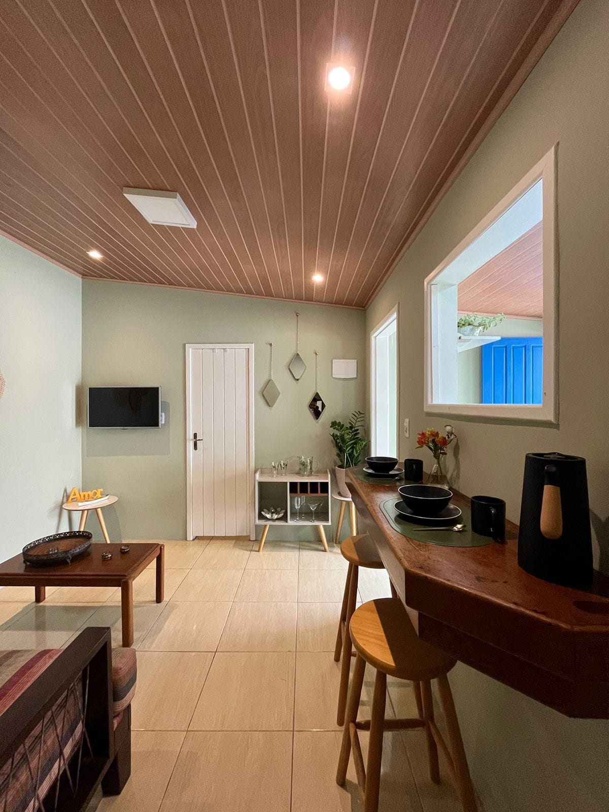 Acogedora cabaña en Cachoeira do Bom Jesus con dormitorio, baño, cocina equipada, sala de TV, wifi, aire acondicionado y estacionamiento.